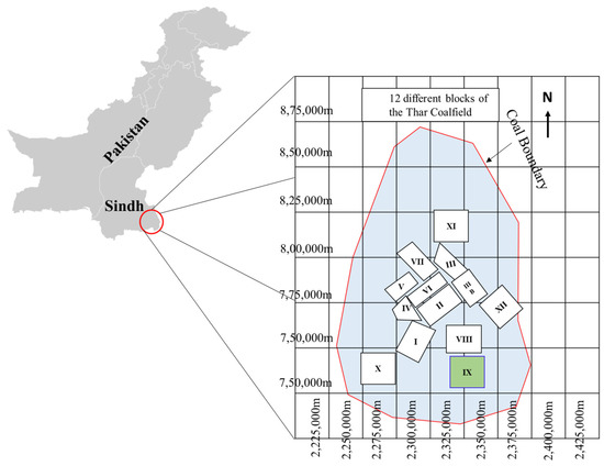 In this study, sedimentary rock samples, i.e., claystone, sandstone, and siltstone, were collected from Block IX of the Thar coalfield, Pakistan. Figure 1 represents the geological site of the collected rock samples [38]. Initially, a total of 78 core rock samples of each type were prepared and subdivided into standardized samples according to ISRM and ASTM standards to maintain the same rock core dimensions as well as geological and geotechnical features [39,40]. Next, these rock samples were tested in the laboratory at the Department of Mining Engineering, Mehran University of Engineering and Technology, to determine the physical and mechanical parameters, including ρd in g/cm3, BTS in MPa, ρwet in g/cm3, and UCS in MPa, using a universal testing machine (UTM), as shown in Figure 2a,b. Figure 2a,b represent the deformed rock core specimen for UCS and BTS tests, respectively. Table 2 presents the five heads and five tails of the dataset of physical and mechanical parameters. Table 3 shows the minimum, maximum, average, and standard deviation of parameters of rock samples determined in the laboratory.