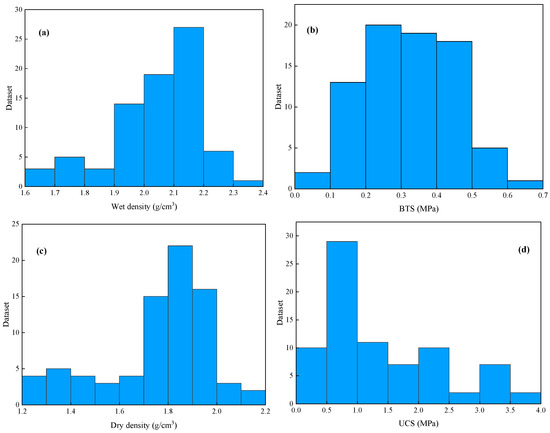 Histogram plots of the original dataset in this study: (a) dry density (g/cm3), (b) BTS (MPa), (c) wet density (g/cm3), and (d) UCS (MPa).