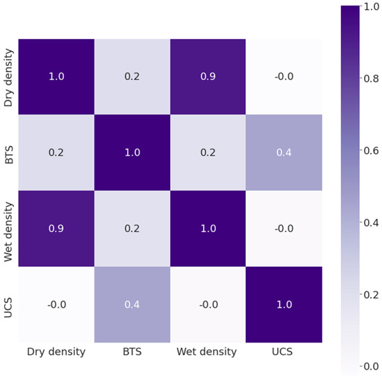 Correlation plot of inputs (dry density (g/cm3), BTS (MPa), and wet density (g/cm3)) and output (UCS (MPa)) of the original dataset in this study.