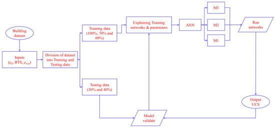 The artificial neural network (ANN) approach was employed to predict UCS with three corresponding inputs: ρd (g/cm3), BTS (MPa), and ρwet (g/cm3). Figure 5 demonstrates the flow chart of the predictive modeling process for UCS. Owing to the small number of resources available for collecting samples, the current study used a limited dataset, that is, 78 samples divided for the established models, including M1, M2, and M3, as presented in Table 4. M1 means the model was trained on the overall dataset, M2 means the model was trained on 70% (55 datasets) of the dataset and tested on 30% (23 datasets) of the dataset, and M3 means the model was trained on 60% (47 datasets) of the dataset and tested on 40% (31 datasets) of the dataset. In addition, Taylor diagram representation was used, which explains a brief qualitative depiction of the best fit of the model to standard deviations and correlations. Moreover, cosine amplitude method (CAM)-based sensitivity analysis was carried out in order to estimate the influence of each input variable on output UCS.