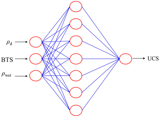 The concept of ANN was originally introduced by Frank Rosenblatt in 1958 [41]. ANN is considered to be the most common and effective soft computing technique based on the function of the human brain’s nervous system [42,43,44,45,46,47]. This technique is mainly used to solve complex rock structure design problems, i.e., mining, civil, geotechnical, geological engineering, and so on. The ANN structure is an essential factor in designing the ultimate prediction model, as the structure affects the learning capability and performance when estimating the network data. The ANN is structured with three layers (i.e., input layer, hidden layer, and output layer) with a number of interrelated units, called neurons, and the method is used to classify the appropriate correlation between the specified input and output parameters [48]. Figure 6 shows the structure of the ANN to estimate UCS in this research. Because of the complexity of the problem, each neuron has sufficient neuron capacity, and each neuron is related to the weight of the next layer [49,50,51]. Equation (1) is used to evaluate the approximate number of neurons in the hidden layer, as the improper selection of the number of neurons in the hidden layer often leads to “under-fitting” and “over-fitting” and must be avoided.