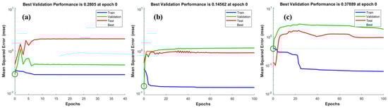 ANN toolbox in MATLAB package 2018a was used in this study to develop the feed-forward back propagation (FFBP) ANN model with 3-7-1. BP is the most commonly applied powerful learning algorithm in multilayer networks [52,53]. The predictive input parameters, ρd, BTS, and ρwet, were allocated to an input layer composed of three neurons to predict UCS of the output layer. The ANN models, M1, M2, and M3, were trained, tested, and validated. One hundred epochs were used to train the models and the minimum validation error was considered as a stopping point to prevent overfitting. Figure 7 represents the validation curves for the training performance of the ANN models of UCS. Therefore, model M2 demonstrates the best performance curve of UCS, with validation error equal to 0.14562, which is reached at 0 epochs. Figure 8 illustrates the training scatter plots of predicted UCS against measured UCS, as M1 for overall dataset and as M2 and M3 for the training and testing dataset, respectively.