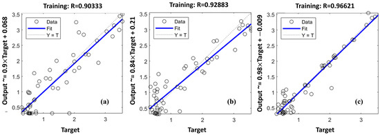 ANN training scatter plots of predicted UCS against measured UCS for (a) M1, (b) M2, and (c) M3.
