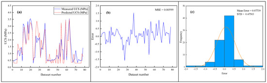 The demonstration of ANN model M1 for UCS. (a) Model M1 results aggregated with measured UCS. (b) The variation in error between the measured and predicted values. (c) Error histogram.