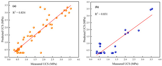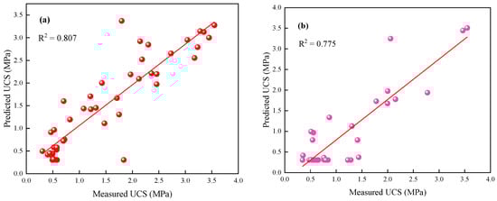 ANN model M2 results for UCS plotted against the measured data for the (a) training and (b) testing data.