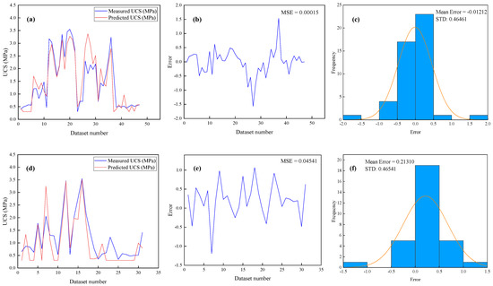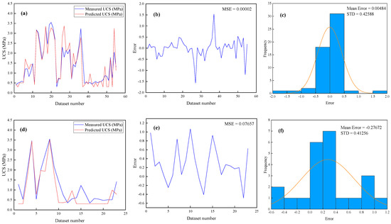 The demonstration of ANN model M3 for UCS. (a) Model M3 results aggregated with the measured UCS. (b) The variation in error between the measured and predicted values. (c) Error histogram for the training data and (d) model M3 results aggregated with the measured data. (e) The variation in error between the measured and predicted values. (f) Error histogram for the testing data.
