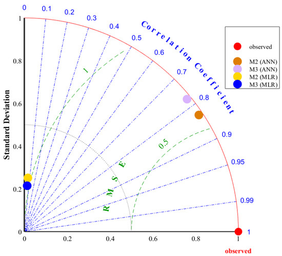 Demonstration of the Taylor diagram for the testing data based on ANN and MLR.
