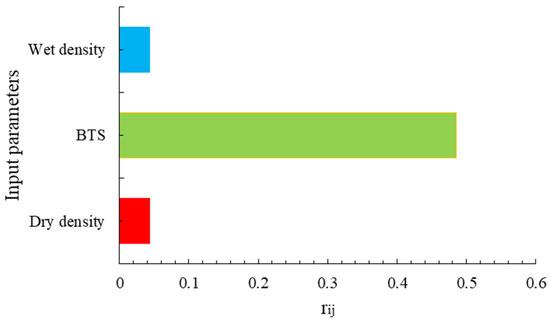 It is crucial to accurately analyze the most important parameters that have a great influence on UCS of rock, which can certainly be problematic in the design of structures. Therefore, in this study, the cosine amplitude method was used to investigate the relative influence of the input parameters on the output [56,57]. The general formula of the adopted method can be expressed as follows: