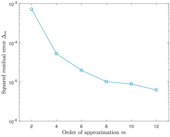 Squared residual error () and computational time versus different orders of approximation () for the selected case.