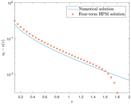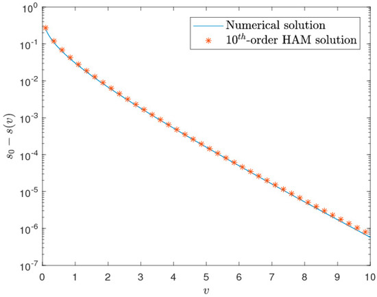 First, the series Equation (10) is substituted into Equation (9), and then the like powers of are equated to obtain the HPM-based solution, Equation (11). In comparison with HAM, the HPM does not contain any additional auxiliary function and auxiliary parameters, which restricts its applicability and also the rate and region of convergence of the series [16,17]. Indeed, the HPM is a special case of HAM, subject to the same set of linear and nonlinear operators and unit auxiliary function when the auxiliary parameter .