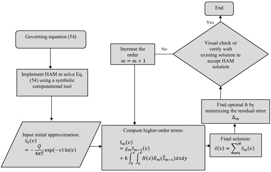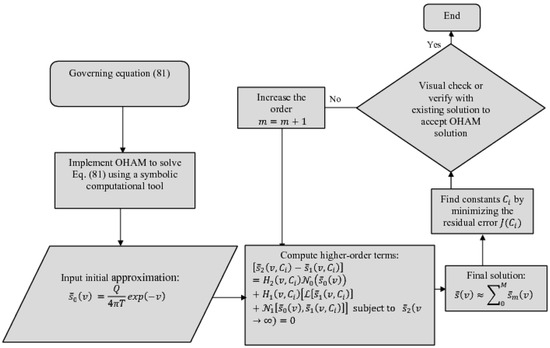 One can obtain the optimal values of parameters by solving this system of equations numerically. Here, we used the MATLAB script fminsearch, which minimizes an unconstrained multivariable function. It was found that only a three-term solution produces accurate values. Therefore, a three-term OHAM solution was computed and compared with the Theis solution, as shown in Figure 10. It can be seen that just three terms of the OHAM-based series agree well with the corresponding analytical solution to the problem. For a quantitative assessment, we also compare the numerical values of the solutions in Table 4. A flowchart containing the steps of OHAM is provided in Figure 11.