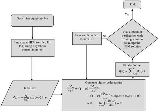 For the selected case, the HPM-based analytical solution was validated over the solution given by [1], where the integral is performed numerically. It may be noted that, unlike HAM, HPM solutions are often valid only within a small domain [16]. Therefore, for our case here, we considered the domain . After assessing the solution within this domain, we observe that the series with four terms is more accurate than the other lower-order terms. The comparison between the Theis solution and the four terms of HPM approximation is given in Figure 8, where it can be seen that as the domain increases, the accuracy of the solution decreases. This is a default problem with HPM, as the methodology does not contain any convergence-control parameter like HAM. Indeed, one may try with different combinations of initial approximations and operators, which might then work in producing a more accurate solution to the problem. Table 3 shows a numerical comparison between the HPM-based values and the Theis solution. For the convenience of the readers, a flowchart containing the steps of HPM is provided in Figure 9.