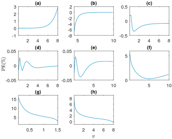 Percentage errors of the approximations: (a) Equation (35) with 40 terms, (b) Equation (38) with 10 terms, (c) Equation (39) [12], (d) Equation (42) [13], (e) Equation (45) [14], (f) Equation (64) (10th-order HAM solution), (g) Equation (78) (four-term HPM solution), and (h) Equation (87) (three-term OHAM solution).