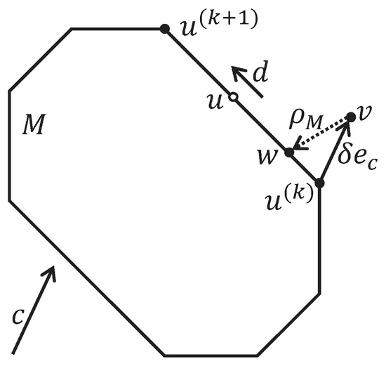 Informally, the next approximation is a relaxed projection of the previous approximation with respect to the furthest hyperplane bounding the half-space not containing . Agmon in [35] showed that sequence converges, as , to a point on the boundary of M.