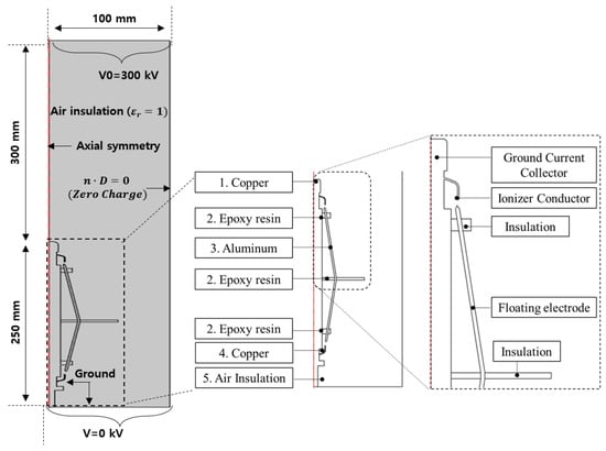 Figure 1 shows computer-aided numerical model geometry in COMSOL Multiphysics. In order to perform the electric field analysis of the CTS-type lightning rod under lightning impulse voltage, it is necessary to understand the structure of the model and the type of materials. The CTS-type lightning rod consists of not only copper and aluminum conductors but also ionizer conductors and insulating support structures such as epoxy resin, as shown in Figure 1. Equations (5), (8) and (11) are applied to all areas of the simulation model as shown in Figure 1. In addition, the zero charge node adds the condition that there is zero charge on the boundary . This is the default boundary condition for exterior boundaries. At interior boundaries, it means that no displacement field can penetrate the boundary and that the electric potential is discontinuous across the boundary. The boundary condition for V in Figure 1 is applied to the ground and CTS-type lightning rod as , while the electric potential considers that the potential voltage is 300 kV (standard lightning impulse voltage is applied until 1.2 . The air space between the tip part of the ground current collector and the opposite conductor is 300 mm.