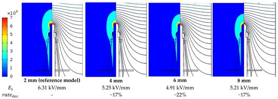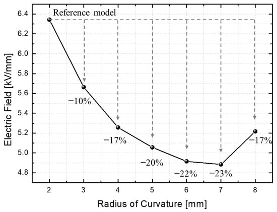 Figure 3 shows the results of the electric field distribution (contour) and electric potential (solid line) depending on the radius of curvature of the tip part of the grounding current collector in air insulation under 300 kV impulse voltage. The is a maximum electric field at the tip part of the grounding current collector, is the decrease rate (%) of the electric field compared with the reference model (2 mm). To reduce the electric field on the relaxation part, the radius of curvature was changed from 2 mm to 8 mm. The electric field decreases with increasing radius of curvature and reaches a minimum at 7 mm (: 4.88 kV/mm, : −23%), and then the electric field shows an increasing trend at 8 mm (5.21 kV/mm, : −17%), as shown in Figure 4. The electric potential also widens the contour gap with increasing radius of curvature; the electric potential distribution at 8 mm curvature radius is formed in the vicinity of the tip part of the ground current collector as dense contour lines.