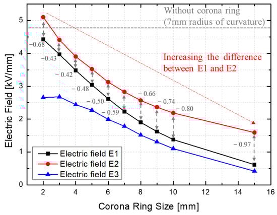 Electric field level depending on the size of the corona ring compared with that without a corona ring.