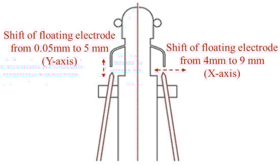 The optimized position of the floating electrode in the direction of the X-axis and Y-axis was 7 mm and 0.1 mm, respectively. If it is possible to locate the floating electrode near the ionizer conductor, the positive and negative charges are equally induced on the ionizer conductor and a floating electrode, and then the local electric field strength near them increases. In addition, this electric field concentration can cause the ionization of the surrounding air insulation, and the corona discharge could have a different starting point at the electric field concentration part than other parts.