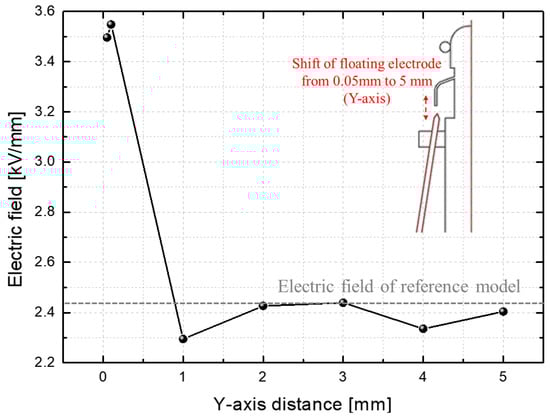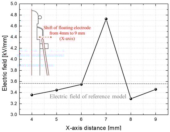 Figure 7 shows the locations of the variable Y-axis and X-axis for simulation. In this Section 3.2, we have focused on electric field concentration, which is different from the results of Section 3.1’s electric field relaxation. The reference X-axis and Y-axis are 3 mm and 6 mm, respectively. In the case of the Y-axis, the simulation analysis was conducted by changing from 0.05 mm to 5 mm based on the reference model. The X-axis was also changed from 4 mm to 9 mm. The results revealed that the electric field increases with a decreasing air space by adjusting the Y-axis position of the floating electrode, as shown in Figure 8. The electric field strength at 0.1 mm of air space was higher than that of the other results for air space (mm). In other words, when the air space is above 1 mm, the electric field decreases by 30% compared to the 0.1 mm air space. The discussion on electric field distribution according to variable air space has been discussed by introducing the electron mean free path (MFP) theory in our previous research work []. If the air space is too far, the generated free electron could not excite another free electron for the electron avalanche between the ionizer conductor and grounding current collector. In other words, the first free electron cannot play a role as the seed of the secondary and tertiary electron avalanches []. In contrast, if the floating electrode is located near the ionizer conductor, the positive and negative charges are equally induced on the ionizer conductor and the floating electrode, and then the local electric field strength near them increases. This electric field concentration can cause the ionization process of the surrounding air insulation, and the corona discharge could have a different starting point at the electric field concentration part than at other parts [].
