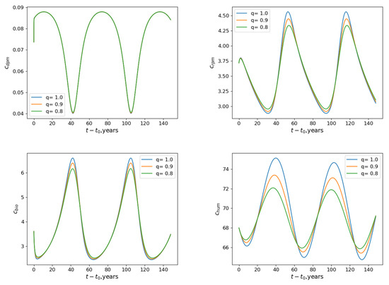 In all presented cases, the solutions of the fractional-order model are qualitatively asymptotic periodical (the theoretical proof of this statement in a quantitative case is beyond the scope of this study), with peaks shifted to the lower values of t when compared with the integer-order local behavior (see Figure 1). These shifts are more pronounced with the change in the form of the curves for (Figure 2). The peak values decrease with the decrease in q for and, on the contrary, increase for .