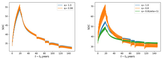 The average absolute errors of modeling with a time step equal to 1 month computed similarly to (15) are given in Table 3. The only case wherein the fractional-order model gave a lower error compared with the integer-order one was the case of and —here, for Scenario 1, the error did not change significantly; for Scenario 2, it was 19% lower, and for Scenario 3, it was 6% higher. The dynamics of SOC indicator in this case are shown in Figure 3. From the obtained solutions, it can be seen that for and small deviations of q from 1, the fractional-order model changes primarily the form of the curves within yearly cycles, with little influence on the long-term dynamics. Thus, more observations are needed to benefit from the usage of such a model in this case.