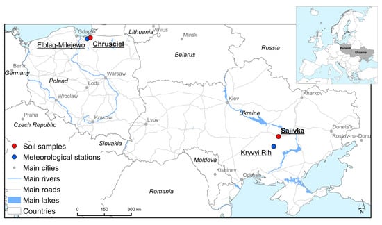 For Poland, the control point was selected from the database of the Polish Chief Inspectorate for Environmental Protection, which contains measurements of soil properties on a regular basis, every 5 years, since 1995, for a network of 216 control points located on arable land throughout the country (https://www.gios.gov.pl/chemizm_gleb/index.php?mod=monit (accessed on 20 December 2022.)). The site, called “Chrusciel”, is characterized by a fertile Luvisol (IUSS Working Group WRB (2022). “World Reference Base for Soil Resources, 4th edition”. IUSS, Vienna) originating from sandy loam. It is considered of high agricultural usefulness, with complexes (Saturnin Zawadzki (red): Gleboznawstwo. PWRiL, 1999. ISBN 83-09-01703-0.) suitable for the cultivation of sugar beet, wheat, red clover, alfalfa, winter rape, and faba bean. The point is under the climatic influence of the Baltic sea and is characterized by the following conditions: annual mean temperature C, mean annual precipitation 710 mm, and growing season length 215 days. The choice of the site was based on its proximity to a meteorological station, Elblag-Milejewo (http://www.meteomanz.com (accessed on 20 December 2022)). Figure 4 presents the spatial distribution of the two points and Table 5 contains their main characteristics.