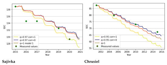 The values of SOC obtained for the integer-order and the fractional-order models (“corr = 0” means , “corr = 1” means ): left for the point “Sajivka”, right for the point “Chrusciel”.