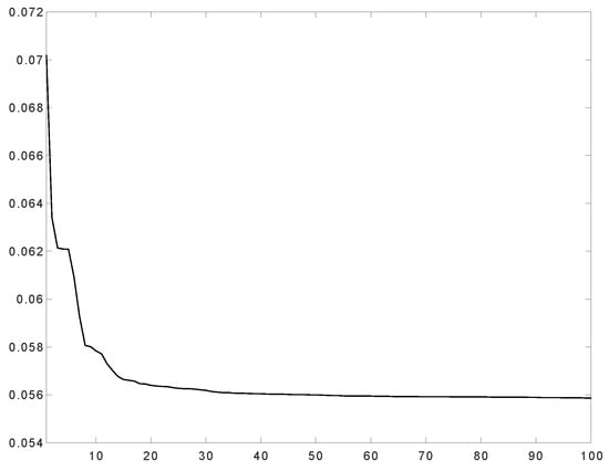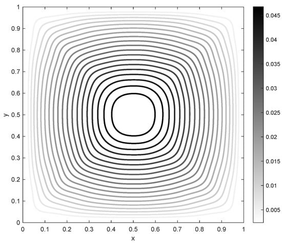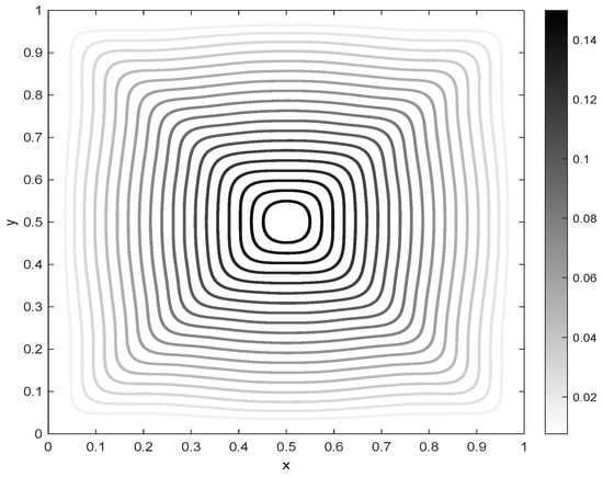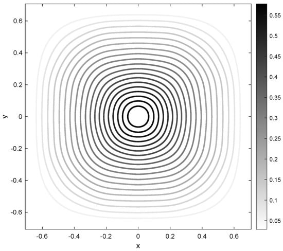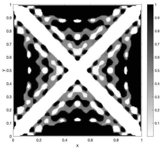 Instead of the local maximization principle analyzed in [], we consider the minimization problem. The numerical procedure applied to the source defined on the with and have given rise to the next optimal configuration, where again it is an approximation both of the nonlocal and local problem. The results are plotted in Figure 4, Figure 5 and Figure 6.