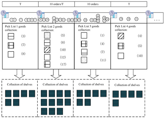 Assuming that orders arrive in accordance with a Poisson distribution of [63], this study proposes a novel approach for generating order batches based on a hybrid time window batching strategy. Specifically, a batch is formed once the cumulative sum of orders reaches , or after a time period of ( being a constant) has elapsed. The generated batches are used to generate pick orders and determine the appropriate target shelf. Figure 1 illustrates the proposed approach, wherein Pick order 1 is generated based on the time interval requirement, Pick order 2 is generated based on both time interval and quantity requirements, Pick order 3 is generated based on the quantity requirement, Pick order 4 is generated based on the time interval requirement, and so on, until all batches are completed. The proposed method addresses the limitations of existing fixed and variable time window batching strategies, thus improving the efficiency of order-picking processes.