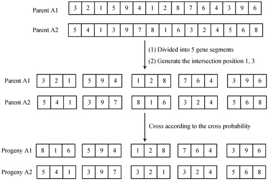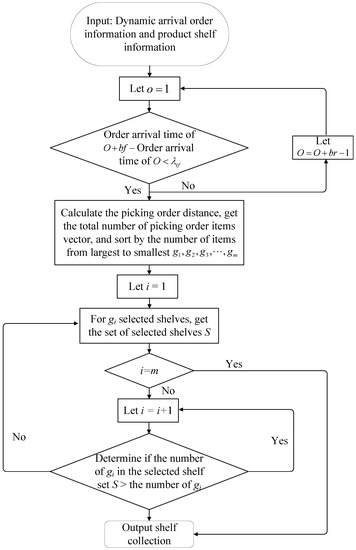 In the above model, the objective function (Equation (1)) represents the minimum number of shelves to be moved for the generated static pick list with known product demand information. Equation (2) means a shelf item constraint, where the number of items contained in the target shelf determined by the warehouse must be sufficient to meet the order-picking requirements for that item. Equation (3) represents a shelf commodity constraint. The quantity of goods contained in the target shelf determined by the warehouse must be able to meet the order selection demand of the commodity. Equation (4) represents the picking shelf constraint. The target shelves to be carried by each picking list shall not be less than one shelf. Equation (5) represents the quantity constraint of order batches. Equations (6) and (7) indicate that the order batch division meets the time interval constraint. Equation (8) indicates that dynamic order division batches meet the quantity constraint. Equation (9) represents the 0–1 variable.