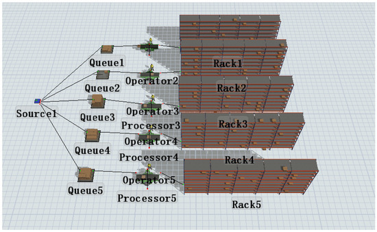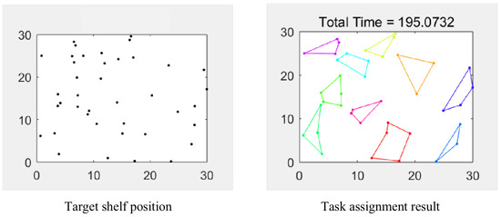 In recent years, the rapid growth of the e-commerce industry has propelled the logistics sector to expand at an unprecedented rate, thereby presenting an elevated demand for logistics service providers. With the rise in order demand, orders are increasingly characterized by small batch sizes, multiple frequencies, small quantities, multiple species, and short cycles, necessitating a faster processing rate for warehousing data and intelligent picking systems [1]. These requirements have motivated the need for innovative solutions to address the challenges associated with e-commerce logistics, thereby promoting the adoption of intelligent and automated warehousing systems. With the development of science and technology, more and more enterprises are paying attention to the “parts to picker” picking system. Compared with the traditional sorting method, the accuracy rate of the “parts to picker” picking system can reach 99.95–99.99%, and the sorting speed is 8–15 times that of the former [2]. In addition, “parts to picker” picking systems have the advantage of efficient storage that takes advantage of dense storage [3,4]. In order to ensure the needs of safe storage and picking needs, the “parts to picker” storage picking system space is more than 2 m below, and the utilization rate is 15–25% [5]. The “parts to picker” picking system adopts intensive storage, and the space utilization rate can reach 45–65%, about four times that of the traditional storage picking system. On this basis, optimization theory and set theory are used to study the dynamic batching problem and task allocation problem in the field of warehousing [6]. Considering the dynamics of the environment and the dynamics of task updating and allocation processes, a more general solution is established which can cover multiple order sets with only one shelf distribution in the assignment task, so as to reduce the amount of shelf handling and achieve the purpose of improving the efficiency of picking [7,8].