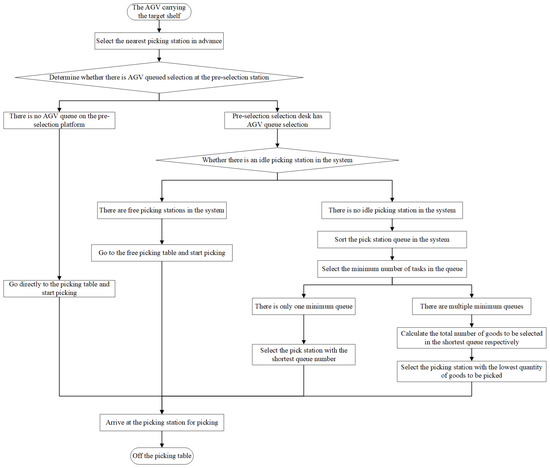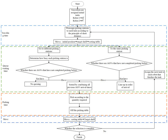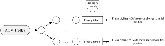 In the context of the “parts to picker” picking system, the core element to optimize storage picking efficiency is the coordinated operation of multiple automated guided vehicles (AGVs) involved in the handling task. Nonetheless, the process of multi-AGV movement and handling presents challenges such as path conflict and collisions. Therefore, a critical endeavor involves addressing the multi-AGV task allocation problem, the multi-AGV cooperative operation problem, and the multi-AGV path planning problem. In this study, we aim to leverage the findings from Section 2 to develop a model that prioritizes the completion time of tasks. Specifically, we propose a random scheduling model that takes into account the time spent on movement, queuing, and picking activities.