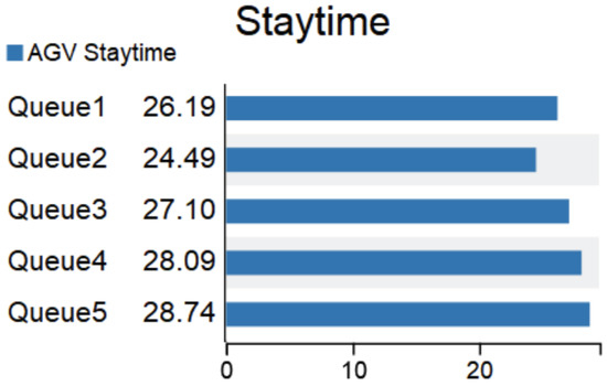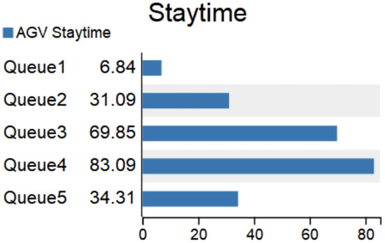 The objective function (Equation (15)) represents the maximum time for minimizing a batch of pick orders corresponding to the completion of the pick task on the target shelf. Equation (17) represents the time for the AGV to complete the picking task, including the moving time of the AGV to carry the shelves, the time of waiting in line at the picking table, and the time spent by a human picking. Equation (18) represents the queuing time of the AGV r when it completes the task l to the task j and arrives at the picking station. The waiting time is determined by the time when the previous task leaves the picking station and the time when it arrives at the picking station. If the arrival time of the latter task is earlier than the end time of the previous task, the time difference is the waiting time. Equation (19) indicates that the time when task picking is completed is the time when task shelves arrive, and the waiting time and picking time at the picking table are determined. Equation (20) indicates that the time point when AGV returns to the position of the original task shelf is the time point when picking is completed plus the movement time of returning to the original task shelf. Equation (21) indicates that a batch of pick order tasks are all assigned to AGVs for handling. Equation (22) indicates that each task can only be carried by one AGV.