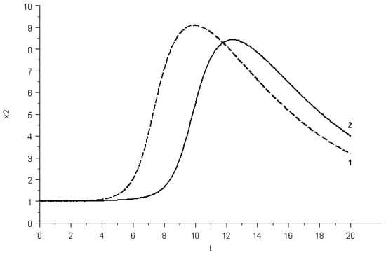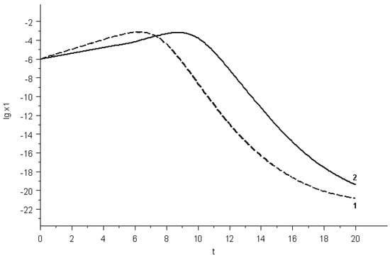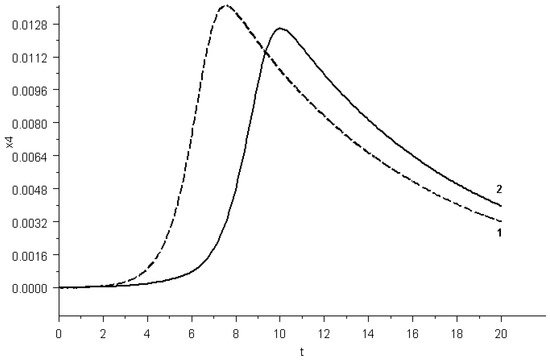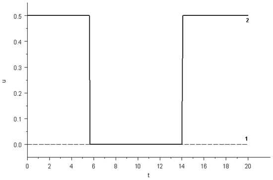 The value of the maximum intensity of the control action was set equal to . The time interval T was set to be equal to 20 days: . The value of the maximum damage to the organism was chosen to be equal to .