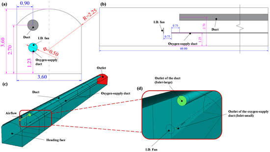 The single-heading tunnel is 3.60 m wide and 3.60 m high, and the side walls are 2.70 m high. The top plate of the single-heading tunnel is an arch structure, the arch part is 0.90 m high, and the radius of the arch is 2.25 m. The cross-sectional area of the single-heading tunnel is 11.98 m2. The single-heading tunnel is shown in Figure 1a. Considering the low atmospheric pressure in the high-altitude area, to prevent negative pressure inside the single-heading tunnel, positive-pressure forced ventilation was selected. Therefore, a duct was provided to supply fresh air into the single-heading tunnel. An oxygen supply duct was provided to supply oxygen into the single-heading tunnel, and an I.D. fan was installed in front of the oxygen supply duct to help distribute incoming oxygen as shown in Figure 1b.