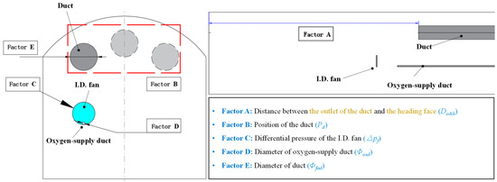 In summary, the distance between the outlet of the duct and the heading face (Do&h), the position of the duct (Pd), the differential pressure of the I.D. fan (∆pf), the diameter of the oxygen supply duct (Φosd), and the diameter of the duct (Φfad) were selected as the study factors for the orthogonal experiments in this study. The factors determined are shown in Figure 2.
