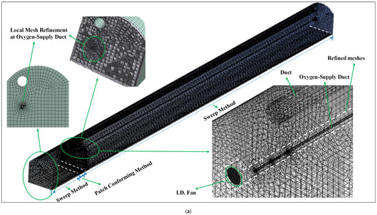 Due to the different fluid types, the inlet of the duct and the oxygen supply duct needed to set different oxygen mass fractions, which required the activation of the species setting function in the Ansys-Fluent boundary conditions setting. Additionally, to activate the species setting function in the boundary condition settings, the species transport model without chemical reactions was enabled; the steady-state solver was enabled to investigate the parameters in the fluid domain at steady-state. In view of the air exchange in the single-heading tunnel studied in this paper, the flow of single phase incompressible gas was simulated, and the effect of a small amount of solid dust floating in the air on the airflow was neglected.