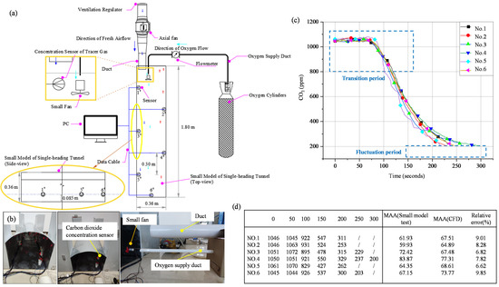 The measurement procedure was as follows: first, we measured the background concentration of CO2 in the lab, sealed the small model, injected CO2, and evenly distributed it inside using a fan; then, we unsealed the small model, inserted the ducts and the small fan, turned on the axial fan, the valve of oxygen and the small fan, and recorded the CO2 decay curve; following this, we used the middle section of the curves to calculate the age of air to prevent the “transition period” at the beginning and the “fluctuation period” at the end from influencing the results [28], as shown in Figure 4c. After removing the “transition period” and “fluctuation period” of the CO2 concentration decay curve obtained from each sensor, Equation (16) was used to obtain the air age at each sensor location in the experiment. Additionally, a CFD case of the small model was developed using the methods presented in Section 2.3.1, Section 2.3.2 and Section 2.3.3. The comparison of the two results is shown in Figure 4d, which indicates that the experimental results and CFD results are in considerable agreement with the error tolerance. The CFD model developed in this study has a high agreement with the real situation, too.