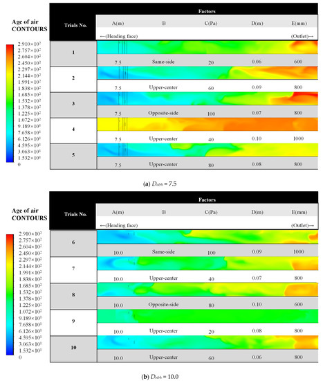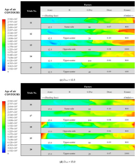 The results of simulation are shown in Figure 5 (unit: seconds). Figure 5 shows the age of air contours of the single-heading tunnel at a height of 1.5 m from the floor, which is often considered to be the height of the breathing zone, and the air quality at this height can have a significant impact on the respiratory health of the workers. By taking the average of the age of air for each trial in the breathing zone, the mean age of air for each trial was obtained as shown in Figure 5f.