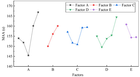 The results of the sensitivity analysis of the experiment are shown in Table 4. By comparing the Rj′ of five factors, the relative influence of the five factors on the MAA can be obtained: distance between the outlet of the duct and the heading face (A) > position of the duct (B) > diameter of oxygen supply duct (D) > diameter of duct (E) > differential pressure of the I.D. fan (C), which shows that the distance between the outlet of the duct and the heading face (Do&h) has the greatest influence on the MAA in the single-heading tunnel. Changing the diameter of the oxygen supply duct has a smaller effect on the MAA than changing Do&h. The effect of the position of the duct in the cross-section on air exchange in the single-heading tunnel is also considerable. The diameter of the oxygen supply duct and the diameter of the duct have a smaller effect on MAA, in which the differential pressure of the I.D. fan has the smallest effect.