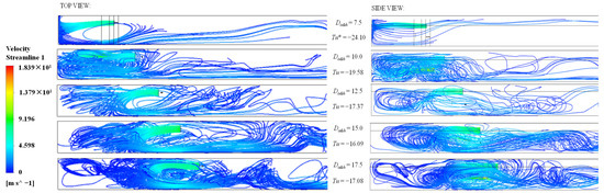 The weakest correlation was demonstrated between the differential pressure of the I.D. fan (Factor C) and the MAA. MAA shows a U-shaped trend with the increase in the differential pressure of the I.D. fan (Factor C), and then tends to remain constant. The streamlines through the I.D. fan are shown in Figure 9. It can be seen that when the differential pressure is 40 Pa or 60 Pa, the scale of swirls is significantly smaller, which leads to a decrease in MAA. This proves that the differential pressure in the range of 40–60 Pa has good compatibility with this tunnel and can reduce the rotational motion of the airflow nicely, and either increasing or decreasing the differential pressure outside of this range will increase the scale of the swirls. When the differential pressure increases to a certain level, the swirls of the airflow expand to the same scale as the tunnel section and no longer expand, leading to almost stopped changes in MAA.