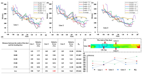 (a) The MAA on Line 1 when changing Do&h; (b) The MAA on Line 2 when changing Do&h; (c) The MAA on Line 3 when changing Do&h; (d) The average MAA on each line when changing Do&h and comparing with average Kij; (e) Three lines set in the breathing zone; (f) The curves of the average MAA on each line and average Kij.