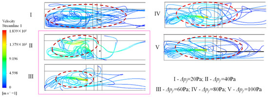 Streamlines of the single-heading tunnel under different I.D. fan differential pressure; the dotted lines indicate the size of swirls, and the two trials in the pink rectangle reach the minimum size of swirls (50 lines for each, and the streamlines’ color represents the flow velocity).