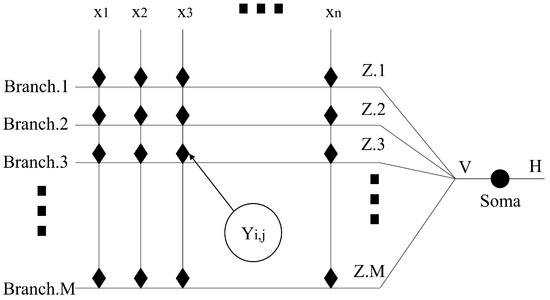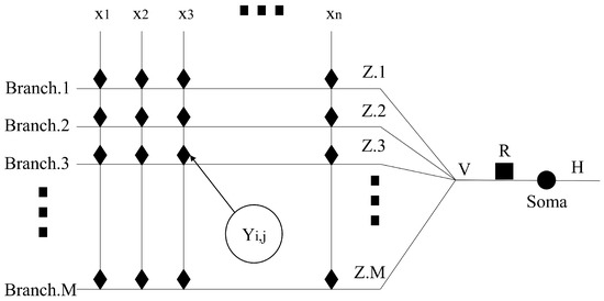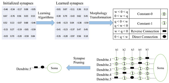 The training process of DNM can be represented by Figure 1. The “pruning” function available in DNM is shown in the figure, where the number is the result of in Equation (1), generally a value between −1 and 1 (few algorithms can obtain a value higher than 1). When outputting information from dendrites, dendrites that contain signal “0” in the synapse will be pruned. In the case of dendrites with successful output, all results with “1” output can be ignored because the synaptic solution is calculated by cumulative multiplication. The essence is that this group of synapses do not obtain results for this training and could not be used to stimulate Soma to make judgments about the problem. In the most extreme case, the number of dendrites is reduced to 1 so that only one set of signals is input to Soma, while in most cases, multiple sets of signals are input to Soma.