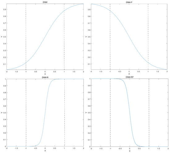 Figure 4, from left to right, shows the single sigmoid function diagram of DNM, DNM-P, DNM-R, and DNM-RP. DNM and DNM-P show completely opposite properties in the mathematical distribution. That means the original inhibition is shown to be excitation on DNM-P. DNM-R and DNM-RP have a higher slope of the vertical axis relative to the horizontal axis when compared to DNM and DNM-P, implying more sensitivity in processing information. Similar to the comparison of DNM and DNM-P, DNM-R and DNM-RP show opposite mathematical distributions.