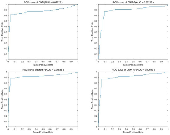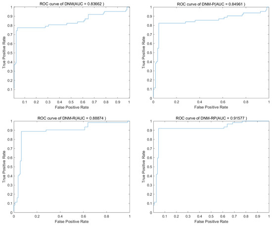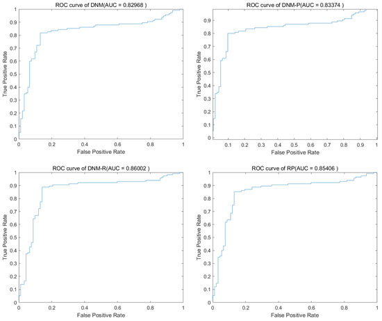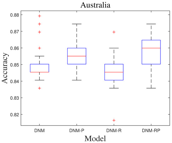 SHADE has a better balance in the search process compared to the improvements of CJADE for DE. In the past with DNM training, it could always achieve the best results as well. Table 10 and Table 11 show the average results and the best results of SHADE training. The results also show that none of the three improved models can achieve an advantage for the full problem when trained with a more powerful algorithm, such as SHADE. Instead, improvements in some specific problems proved to be valuable for model improvements. Overall, DNM-R exhibits accuracy comparable to DNM, with a slight overall improvement. On the other hand, DNM-RP shows a slightly lower accuracy rate compared to DNM. When analyzed in conjunction with the results of DNM-P, this can be attributed to the unfavorable effect of neuronal excitation improvement on SHADE training. However, this does not prove that our improvement is meaningless because DNM-P and DNM-RP have the best accuracy in some problems, such as “KrVsKpEW” and “BreastEW”. Figure 13 shows the ROC of SHADE in problem “Australia”. The images show that all four models have some effect on the training of this problem. Figure 14 shows the box diagram of SHADE in problem “Australia”, and the median accuracy of DNM-RP was better than that of others. Although the best result of DNM is clearly better than the other three models, such extreme values require more computational resources to be obtained, so it can better save computational resources when using DNM-RP. Therefore, the trade-off between models becomes difficult when using SHADE as the training algorithm. In terms of results, a more balanced outcome can be achieved using DNM or DNM-R, which is beneficial for dealing with unknown problems. For problems that require higher accuracy, we suggest training all four models to obtain the best results.
