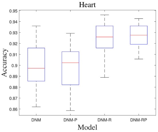 Biogeography-based optimization (BBO) is a swarm intelligence optimization algorithm proposed by Prof. Simon in 2008 [48]. Inspired by biogeography, the design of the migration operator and the variation operator mimics the migration and variation processes of species between biogeographic habitats, respectively. Table 2 shows the results of BBO in training. From the results, all three improvements led to changes in performance, with DNM-R and DNM-RP showing the most significant improvement. On average, DNM-R demonstrated a 3% improvement in accuracy, while DNM-RP showed an average improvement of 1.6%. However, DNM-P exhibited an average accuracy decrease of −1%, possibly due to the model’s search space not being suitable for BBO, leading to local optima or overfitting. The classification problem is a practical problem, and the comparison of using the optimal result in the comparison also has some significance. Table 3 shows the best result of the algorithm in thirty runs. The best solution ranking is also the highest for DNM-RP. This means that if DNM-RP is used as the trained model, better results than DNM can be obtained. Figure 5 shows the receiver operating characteristic curve (ROC) of BBO in problem “Heart”. It means all four models tested on this problem showed their classification results to be valid, but the accuracy of the three improved models was higher. It is arguable that the improved model is more competitive and reliable than DNM for BBO. Figure 6 shows the box diagram of BBO in problem “Heart”, and the median accuracy of all three new models was better than that of the original model. In the figure, DNM and DNM-P behave close to each other and DNM-R and DNM-RP behave close to each other. This implies that the new neurotransmitter proposed in this paper plays an important role under the problem. Therefore, if BBO is employed as the training algorithm, DNM-R or DNM-RP should be preferred as the training model for the study. In practical applications, DNM-RP should be utilized as a tool since it exhibits better performance in terms of both average and best results.