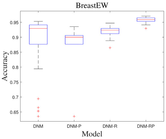 SASS is an adaptive spherical search (SS) algorithm, which was proposed to solve the bound-constrained non-linear global optimization problem in 2019. Table 4 shows the experimental result of SASS. From there, it is difficult for different models to achieve advantages on all problems for high-performing algorithms. For the problems “Heart” and “Ionosphere”, DNM-R showed a notable improvement in mean accuracy of over 1%, indicating significant progress. Similarly, DNM-P demonstrated remarkable performance improvement of more than 5% for “KrVsKpEW” and “Tic-tac-toe”. For DNM-RP, its role is regressive. Compared to the boost in BBO, the results shown under SASS training prove that the degree of fitness varies between algorithms and different models is important, and then a richer variety of models has a better chance to solve realistic problems. In Table 5, while comparing the best results of SASS, it is clearer to see that a single model does not have the full advantage. Although the DNM ranked highest under the overall ranking, it obtained the best results in only half of the problems; the other models still have their advantages. Figure 7 shows the ROC of SASS in problem “BreastEW”, DNM-RP has the most stable performance among them. Since different models have problems in which they excel, it can be assumed that our improvements are necessary. Figure 8 shows the box diagram of SASS in problem “BreastEW”, and the median accuracy of DNM-RP was better than that of others. It is evident that training DNM using this algorithm leads to a large number of extreme solutions, indicating the need to repeat DNM training with this algorithm multiple times in practical applications, resulting in significant waste of computational resources and time. However, if DNM-R is used as the trained model, it can be applied quickly after a short training period, thus compensating for the work performed before using a more accurate solution. Therefore, for training with SASS, we prefer to use DNM-R.