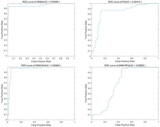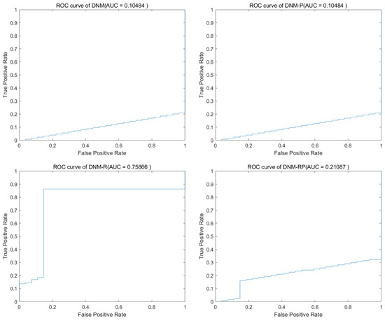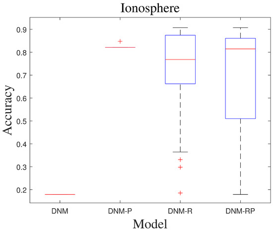 Chaotic local search-based differential evolution algorithms for optimization (CJADE) is an advanced algorithm that uses chaotic local search [49]. Due to the strong convergence ability common in differential evolutionary algorithms (DEs) as well as the weak exploration ability, its extremes often appear in DNM training. Because CJADE emphasizes local search, its risk of falling into a local optimum is also greatly increased (good results will be better, and poor results will be worse). Table 6 and Table 7 show the average results and the best results of CJADE training. The new models somewhat optimize the search structure for most problems, thus producing fewer extreme values and more stable results. Therefore, in the training of CJADE, the results of all three new models are better than DNM. In the experiments conducted using CJADE, it was observed that the problem “SpectEW” consistently achieved the best results when trained with the first three algorithms using DNM. This suggests that DNM is well suited for solving this problem, and it may not be advisable to use the new model for similar problems. The comparison of the best results shows that DNM-R and DNM-RP with the new neurotransmitter is a more suitable model compared with DNM. This certainly validates the validity of this design once again. The results of DNM are clearly invalid for the question “Ionosphere”, while DNM-R and DNM-RP improve the accuracy to over 90%, which is a huge improvement compared to the 18% accuracy of DNM. Compared to DNM, DNM-RP improves accuracy by an average of 10%, DNM-R improves accuracy by an average of 10.5%, and DNM-P improves accuracy by only 1.8%. Figure 9 shows the ROC of CJADE in problem “Ionosphere”. Among them, the results of DNM and DNM-P showed that their training was useless, and DNM-RP, although improved, was still useless. Only the training of DNM-R showed full validity. Figure 10 shows the box diagram of CJADE in problem “Ionosphere”, and the median accuracy of all three new models was better than that of the original model. Due to its higher median and extremely high stability, DNM-P is considered to be the preferable option for this problem. However, given that the combined performance of DNM-P is not impressive, it would be best to use DNM-RP when dealing with a new and unresolved problem. Since DNM and DNM-RP are identical in the best results of problem “SpectEW”, and the average ranking of DNM-RP is better than that of DNM and the comparison of repeated experiments is better than that of DNM, there is no problem in using DNM-RP instead of DNM.