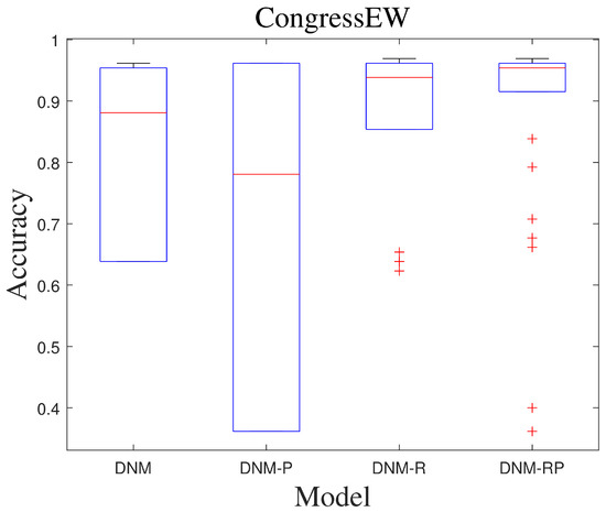 SCJADE is an improvement based on CJADE [50], and its improvement in chaotic local search has further enhanced the algorithm exploitation capability. The performance demonstrated by this most biased exploitation algorithm on neuron training is also of reference value because it may exhibit more extreme results, such as higher best accuracy and worse lowest accuracy. With this type of algorithm, there is an opportunity to explore results that cannot be obtained with other algorithms for a problem. Table 8 and Table 9 show the average results and the best results of SCJADE training. The results show a high degree of similarity to CJADE, and it can be concluded that upgrading the exploitation capability of the algorithm does not lead to significant improvements when training DNMs to solve classification problems. However, in the ranking of the best results, all the improved models achieved a better ranking than DNM. More exploitation algorithms are more capable of training neurons to obtain better best results. Compared to DNM, DNM-RP improves accuracy by an average of 9.7%, DNM-R improves accuracy by an average of 10.8%, and DNM-P improves accuracy by only 1.6%. Compared to CJADE, there is less accuracy improvement when training with SCJADE. Figure 11 shows the ROC of SCJADE in problem “CongressEW”. The graph likewise shows that training on the DNM-R is the best, which is also the same as for CJADE. Figure 12 shows the box diagram of SCJADE in problem “CongressEW”; the median accuracy of DNM-RP is better than that of others. When it comes to training with SCJADE, we highly recommend using DNM-R and DNM-RP models with new neurotransmitters, as they showed the best performance. Based on the training outcomes of CJADE and SCJADE, we conclude that using this class of algorithms to train neurons is not a good option since they both significantly underperformed compared to BBO and SASS.
